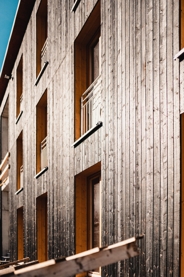 Das mit der Planung beauftragte Freiburger Architekturbüro stocker.dewes hatte bereits beim Bau der Flüchtlingsunterkünfte Erfahrung mit Holzmodulen gesammelt und den flexiblen Einsatz schätzen gelernt. So konnten problemlos kleinere Wohneinheiten gestaltet werden. Die einheitlich großen Module stapeln sich über- und nebeneinander zu einem geschlossenen Gebäuderiegel, der durch zwei Treppenhauskerne in drei Einheiten mit je drei abgeschlossenen Wohnungen unterteilt wird. Die Treppenhäuser bieten zudem zwei unabhängige Fluchtwege und wurden aufgrund brandschutztechnischer Vorgaben in Stahlbetonmassivbauweise errichtet.