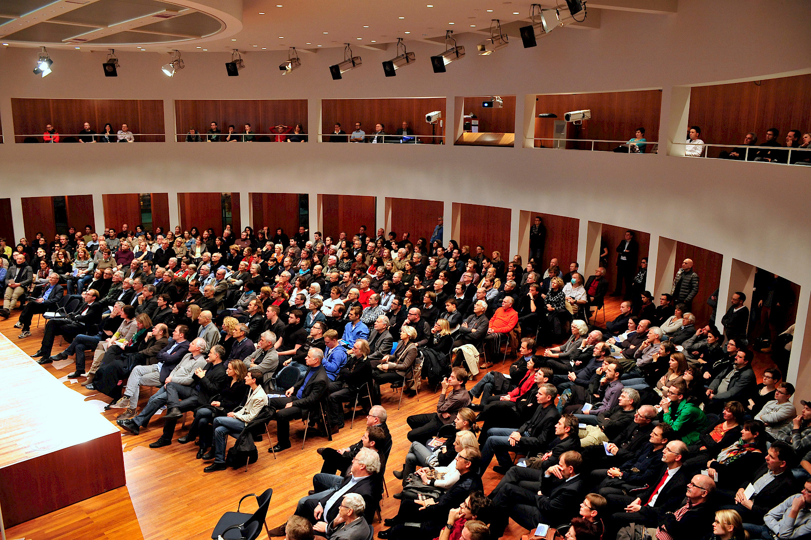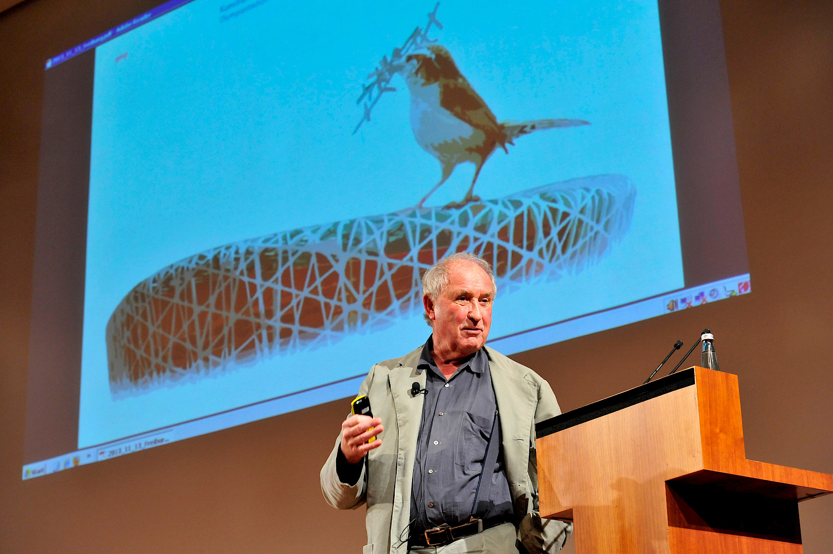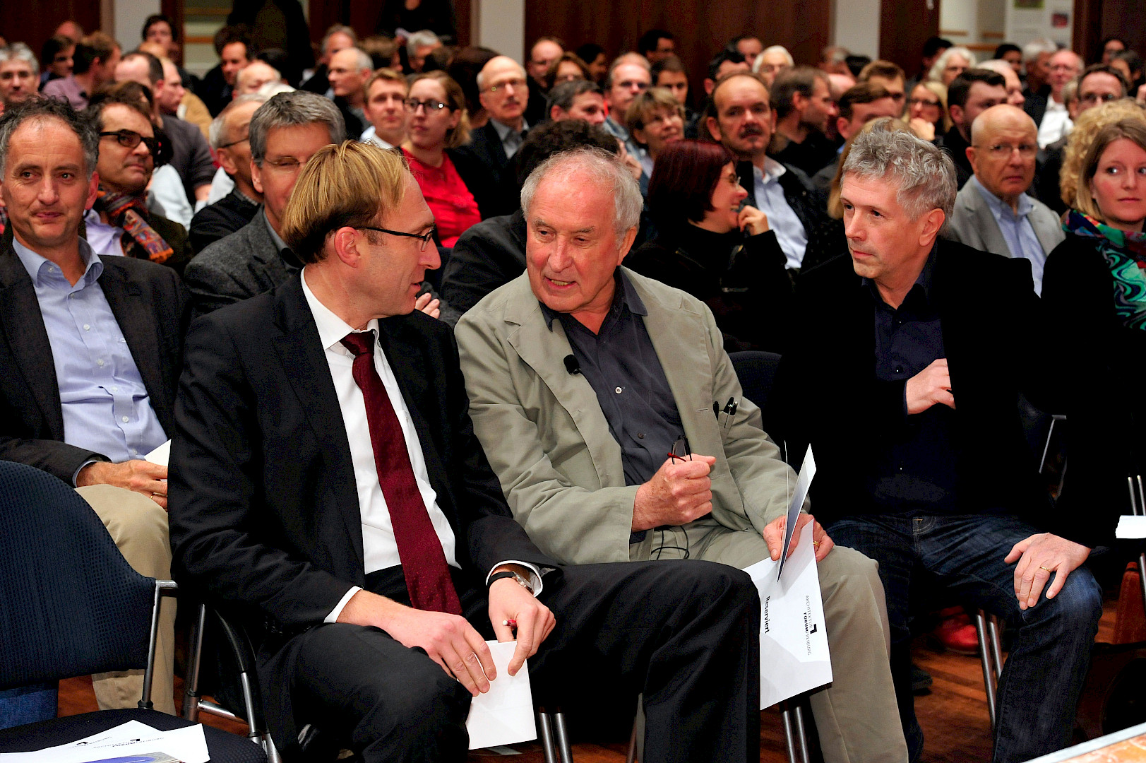 Im voll besetzten Runden Saal des Freiburger Konzerthauses beließ es Volkwin Marg nicht bei einer Werkschau der zahlreichen Stadien, die das international tätige Büro gmp – Architekten von Gerkan, Marg und Partner realisiert hat, sondern brachte seinen rund 320 Zuhörern in einem kurzweiligen Vortrag sein Architekturverständnis nahe. Für ihn ist Architektur eine Synthese aus Funktion, Konstruktion und Deutung. Nach seiner Auffassung ist Architektur dann gelungen, wenn „die innere Funktion, die dafür außergewöhnliche Konstruktion und die zeichenhafte Deutung des kulturellen Kontextes – des Genius Loci – sinnfällig zu einer harmonischen Einheit verschmelzen“.