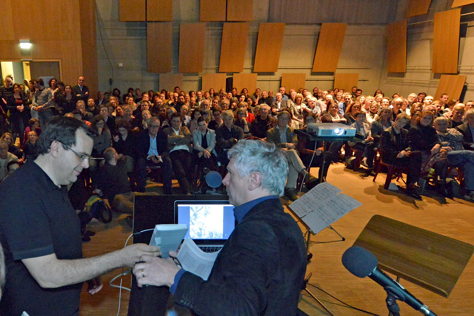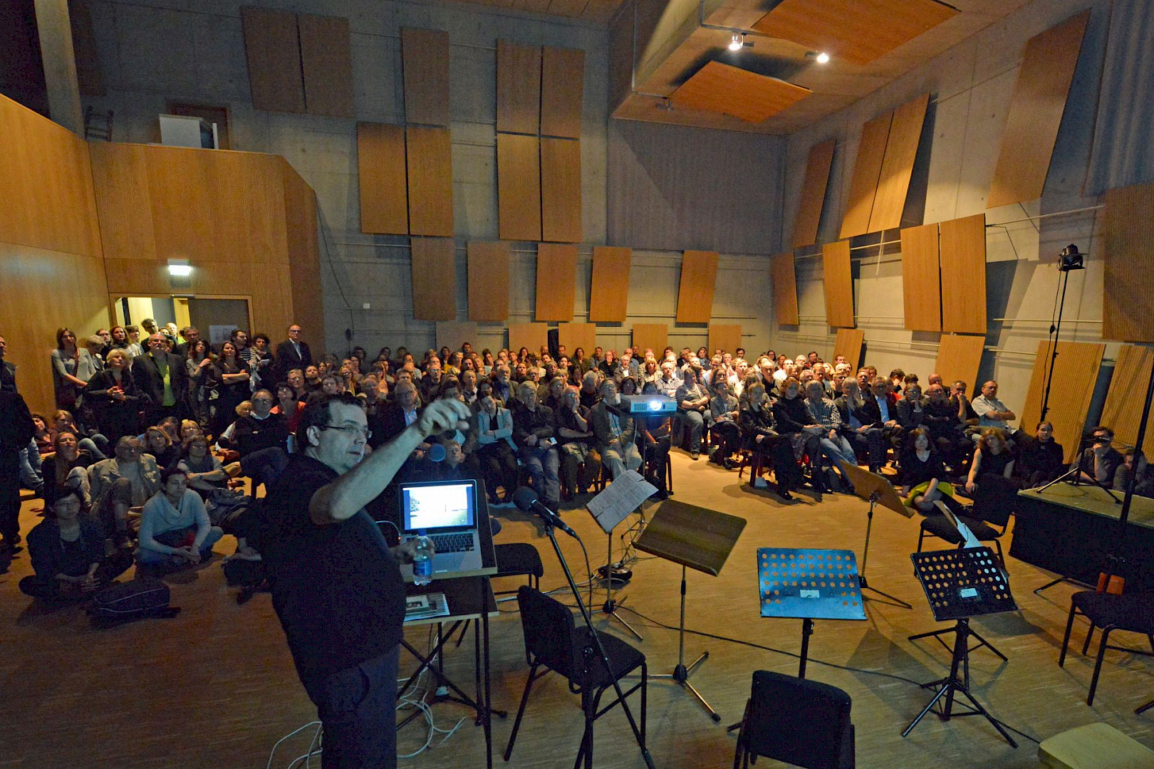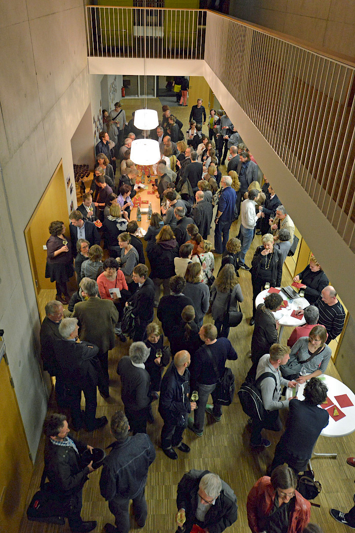 Das Architekturforum hat seinen fast 200 Gästen etwas Besonderes geboten und in das Ensemblehaus zu einem Vortrag von Stefan Marte über die Sinnlichkeit des Betons eingeladen. Umspielt wurde der Vortrag mit experimenteller Musik vom Ensemble Recherche. Architekten verließen die Welt des rechten Winkels und hörten spitzem Pizzicato zu. Musikbegeisterte wiederum staunten über die Ausdruckskraft von Beton. Die Veranstaltung zudem war eine seltene Gelegenheit, das als Probenraum gedachte Ensemblehaus von innen zu sehen.