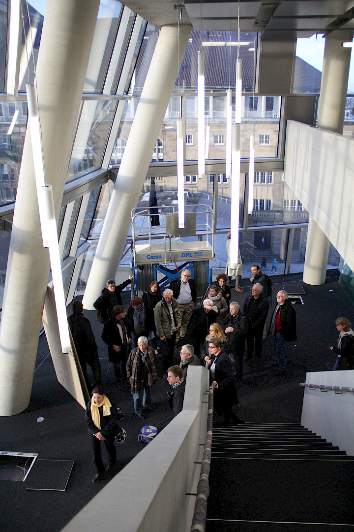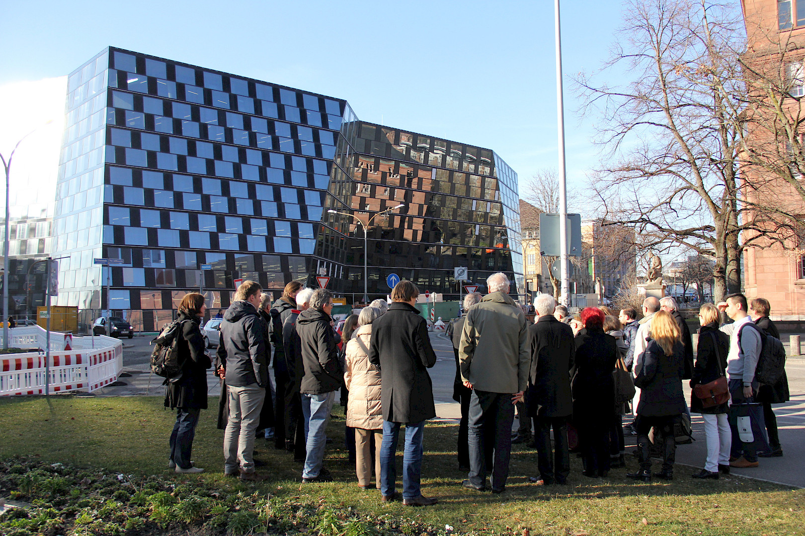 In dieser Hinsicht ist die Freiburger Universitätsbibliothek eine ganz besondere Herausforderung. Davon konnten sich die Mitglieder des Architekturforums Freiburg bei einem Besuch im Rahmen von „Architektur vor Ort“ überzeugen. Die Kollegen waren die Ersten, denen die UB kurz vor der Fertigstellung vom Architekten Heinrich Degelo, dem Universitätsbauamt Freiburg, vertreten durch dessen Leiter Karl-Heinz Bühler und Projektleiter Andreas Haitz-Fliehmann mit einem Blick hinter die Kulissen vorgestellt wurde.