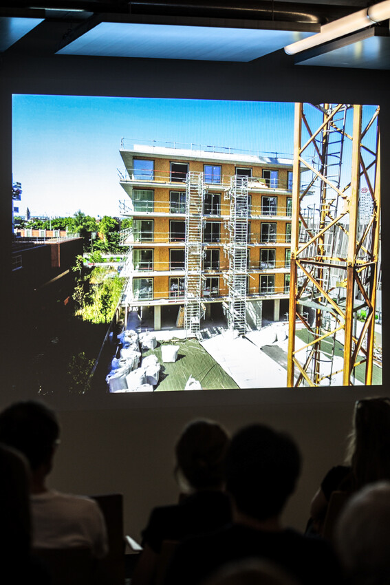 Auch in Paris wollten die Architekten ihr Konzept anwenden, doch hier trafen sie auf schwierige und komplizierte Städtebauregeln, zentralisierte Behörden und große, monopolisierte Baukonzerne. Im Gegensatz zu den Niederlanden verfügt man in Frankreich kaum über Erfahrung mit industriellem Wohnungsbau. Das alles trieb die Baukosten in die Höhe – was durch Improvisieren wieder ausgeglichen wurde. An dieser Stelle wurde der Vortrag zu einem unterhaltsamen Bericht von der Baustelle, über Missgeschicke und unangenehme Überraschungen. Dennoch konnten Kempe Thill ihr Programm weitgehend realisieren: 55 Wohnungen sind in zwei kompakten Würfeln organisiert, die über einen kleinen Gemeinschaftsgarten miteinander verbunden sind. Sämtliche Grundrisse sind flexibel, die Fassaden sind mit Schiebetüren verglast. Wintergärten ziehen sich rund um die Fassade, sodass ein Außenraum entsteht, der nebenbei auch als Klima- und Lärmschutz dient.