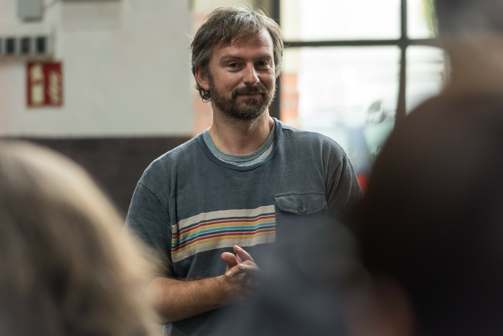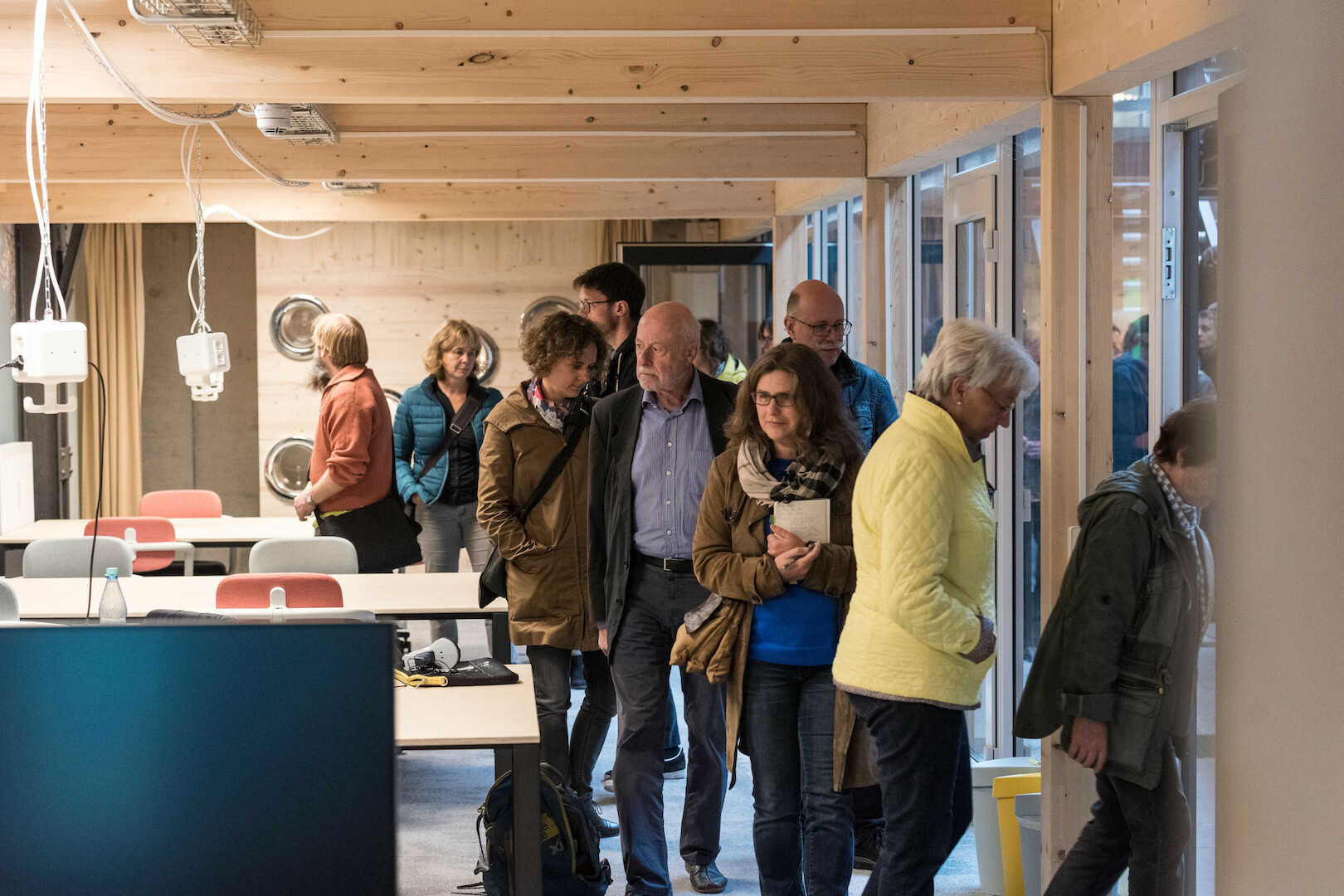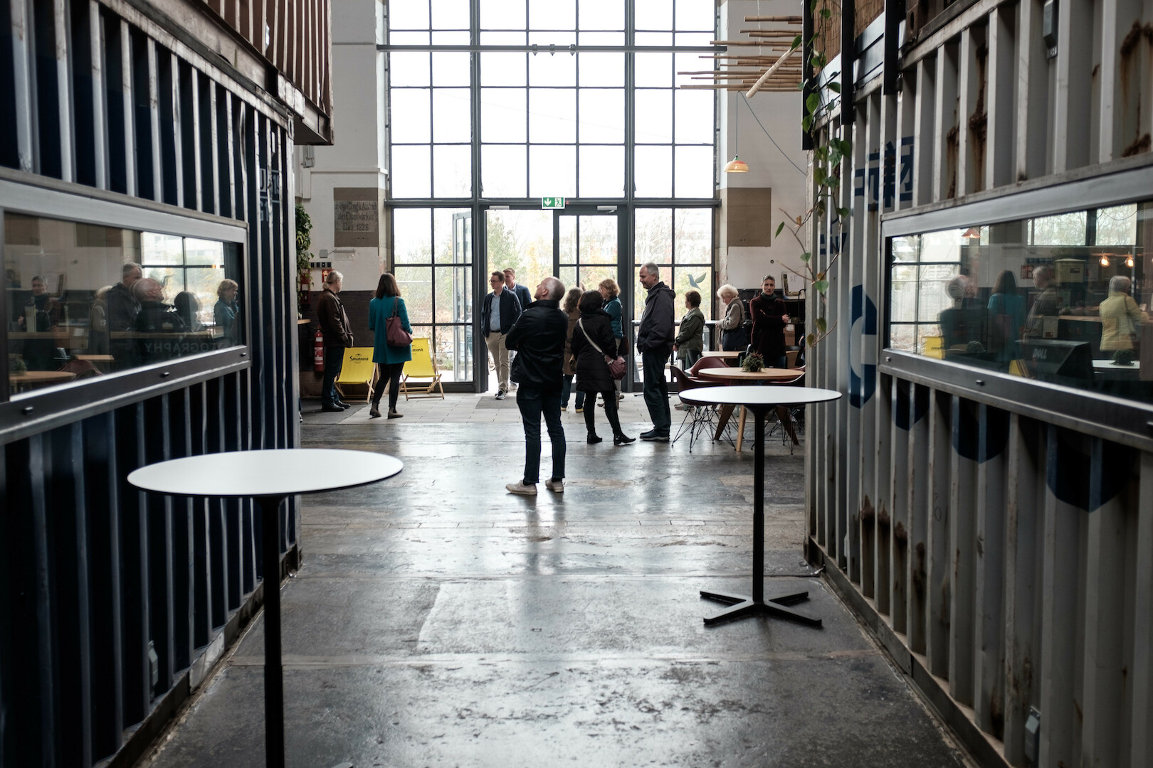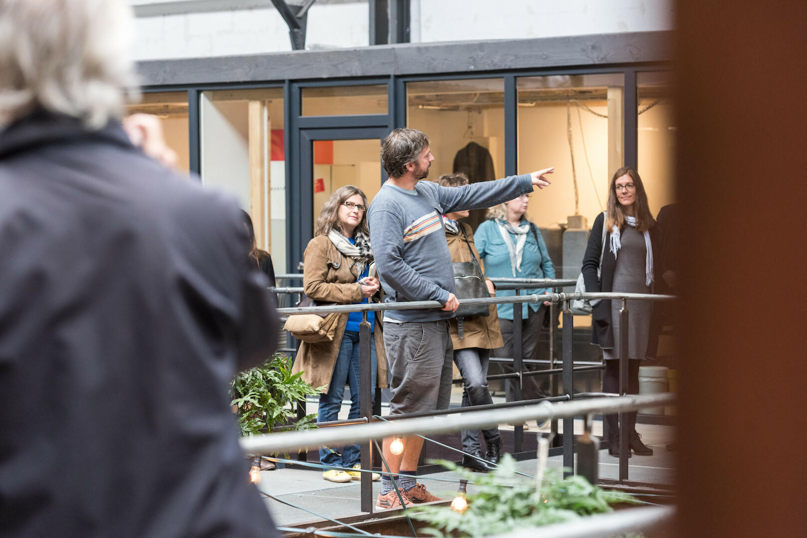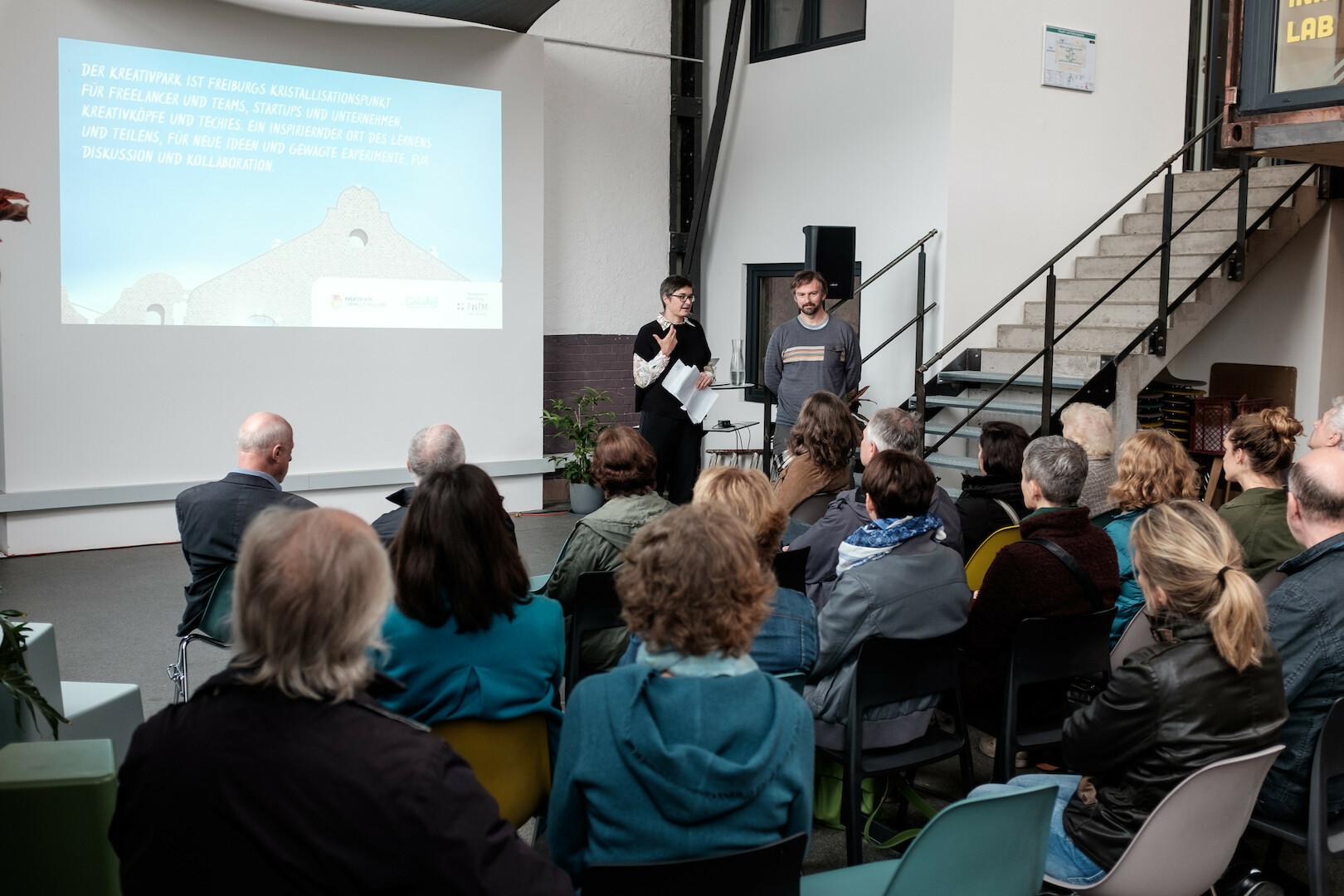 Fast 50 Besucher interessierten sich für die Mittagsführung durch die neue alte Location. Bei diesen Führungen, die immer im Rahmen der trinationalen Architekturtage – die in diesem Herbst übrigens zum 18. Mal und unter dem passenden Motto „ensemble(s) – gemeinsam(er)“ stattfanden – angeboten werden, stellen öffentlich bekannte Personen ein Gebäude vor. Hanna Böhme, die seit Anfang 2018 die FWTM leitet und der Betreiber des Kreativparks, Hagen Krohn, führten die Gruppe durch das einzigartige Industriedenkmal des frühen 20. Jahrhunderts und stellten das Konzept des Kreativparks vor. Die FWTM hatte nach einer Analyse im Jahr 2015 erkannt, dass in Freiburg Kreative 6% des Bruttosozialprodukts in FR ausmachen. Das führte zu dem Willen, diese Unternehmen stärker zu fördern – unter anderem, indem man ihnen Räume anbietet. Hagen Krohn, der bereits den Grünhof seit einigen Jahren erfolgreich betreibt, betonte, dass vor allem das Netzwerken im Vordergrund steht. „Hier arbeiten sehr unterschiedliche Menschen mit ganz unterschiedlichen Hintergründen und in verschiedensten Branchen. Wir Betreiber sehen uns als Kuratoren, die diese Menschen zusammenbringen, damit sie voneinander profitieren können“.. Kein Wunder also, dass es überall Inseln gibt, an denen man sich austauschen oder auch nur chillen kann – denn entspannt ist das Gehirn am kreativsten. Die Arbeitsräume, die vom temporären Einzelplatz bis zu stationären Teambüros alles anbieten, sind dagegen eher klein. Dafür wird die komplette Infrastruktur vom Drucker bis zum superschnellen Internet zur Verfügung gestellt. Hinzu kommen Meetingräume, die auch von externen Firmen genutzt werden können. Denn auch der Kontakt mit etablierten KMUs soll aktiv unterstützt werden. Programme wie der „smart green accelerator“ oder das „social innovation lab“ fördern Geschäftsideen im grünen und sozialen Bereich. Daran nehmen auch Partner aus Kommune, Kammern und Verbänden, Wissenschaft und Industrie teil. Diese beteiligen sich auch an der Finanzierung des Projekts, die andere Quelle sind die Mieteinnahmen.