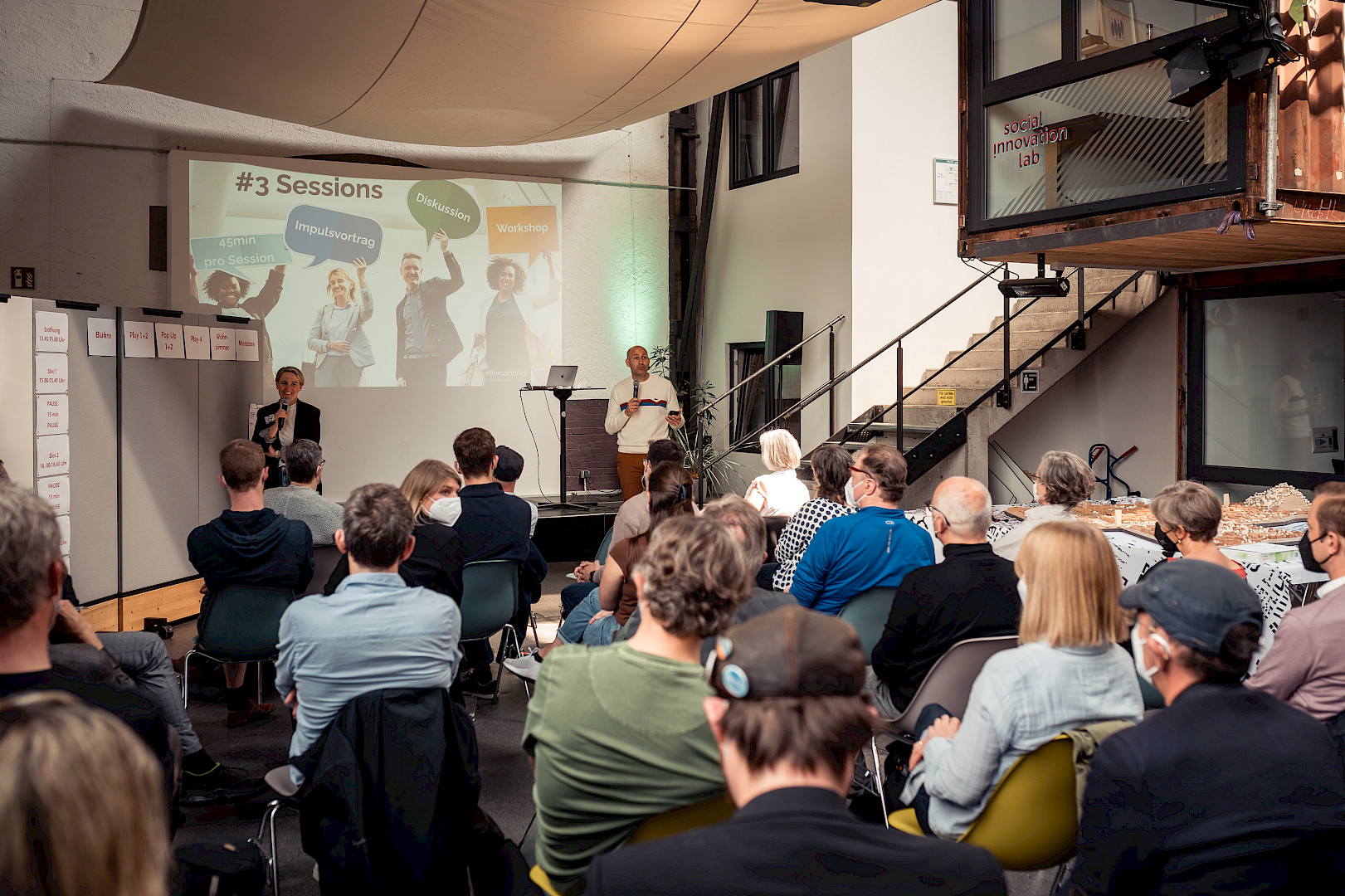 Akteure aus Handel, Kultur, Gastronomie, Politik und Verwaltung, Student*innen und Schüler*innen sowie zahlreiche Architekt*innen kamen in der Lokhalle zusammen, um sich in kleinen Diskussionsrunden über die Stärken und Schwächen der Innenstadt auszutauschen. Bei einem Barcamp kann jeder und jede mitmachen, entweder indem man selbst das Thema einer Session formuliert oder sich aktiv an den Diskussionen innerhalb einer Session einbringt.