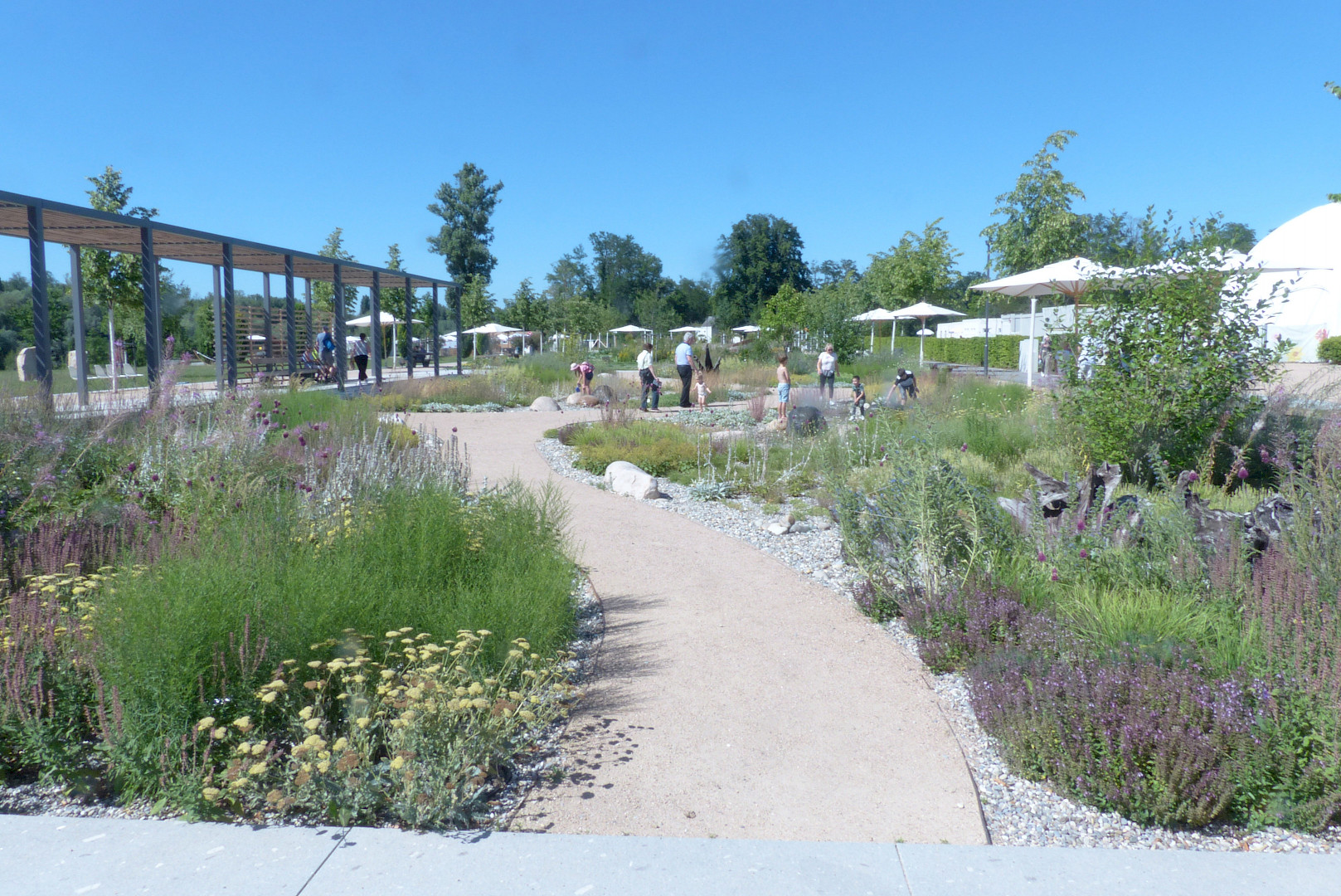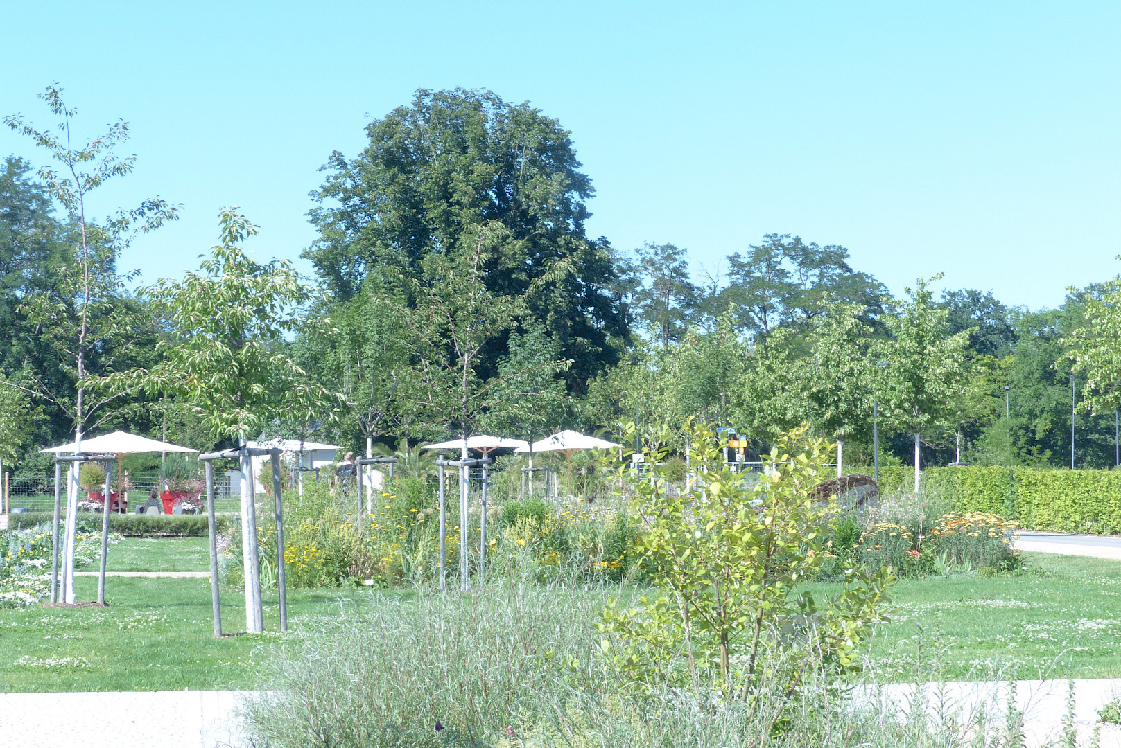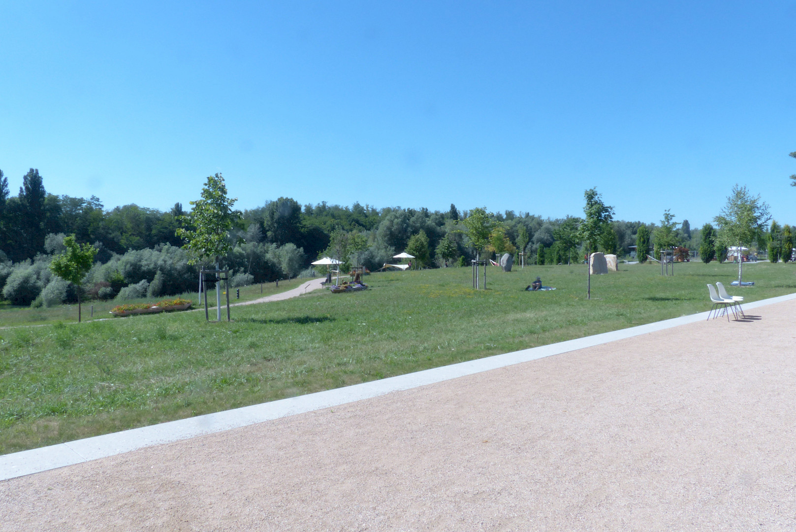 Auf der 700 m langen und 30 m breiten Rheinterrasse findet man urbane Anlagen wie Spielplätze, Staudengärten, Schattendächer und schattenspendende Baumreihen. Am Stadtpark am Wuhrloch ging es schwerpunktmäßig um Bauen im Bestand. Hier wurde ein in die Jahre gekommener Stadtpark revitalisiert.