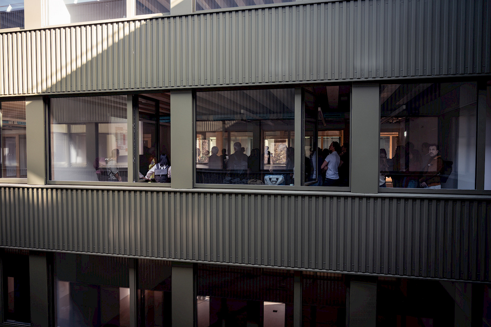 Birk Heilmeyer und Frenzel Architekten wurden mit dem Neubau des Kollegiengebäudes 1 beauftragt. Der neue, viergeschossige konsequent als Holzbau entwickelte Baukörper bettet sich, in Form und Höhe angemessen, zwischen das bestehende Wohnheim und das Kollegiengebäude II ins Grüne, ohne den Baumbestand zu gefährden. Trotz seines solitären Charakters kann der Neubau das Campusareal nach Süden abschließen, die städtebauliche Flucht entlang des Kunzenweges durch den Gebäudeversprung nachzeichnen und eine Eingangsgeste definieren.